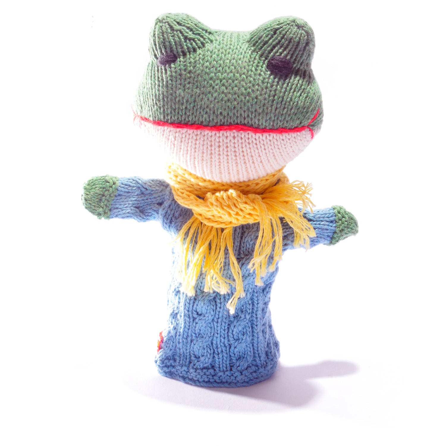 Beautiful hand-knitted hand puppet in organic cotton. The puppet is about 26cm tall. It is large enough to fit most adult hands. Machine washable