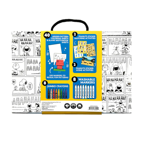 Perfect for travel, family craft time, or school projects, this Peanuts colouring activity kit is neatly packed in a portable Peanuts-themed carrying case that's colourable!