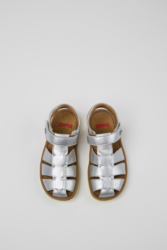 Grey / Silver calfskin closed sandals for kids with hook-and-loop system and rubber outsoles (20% recycled).