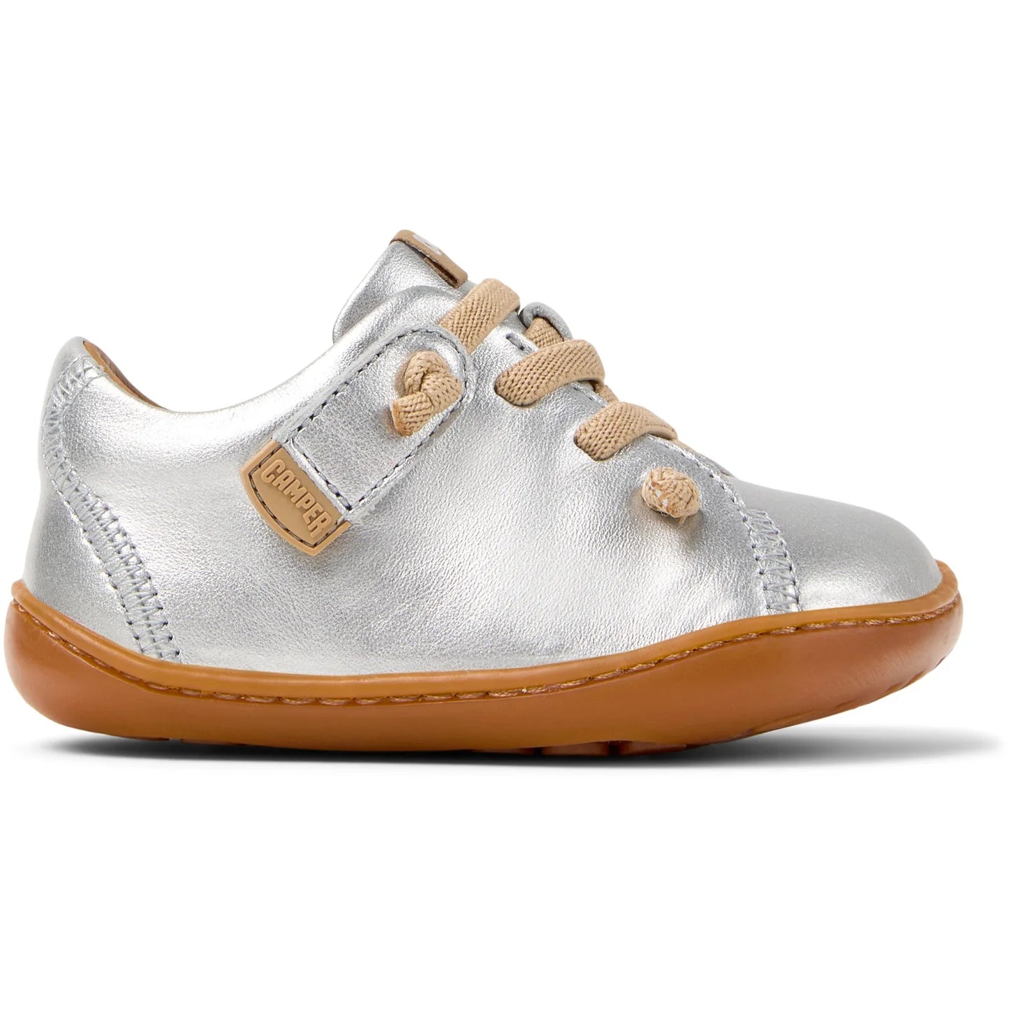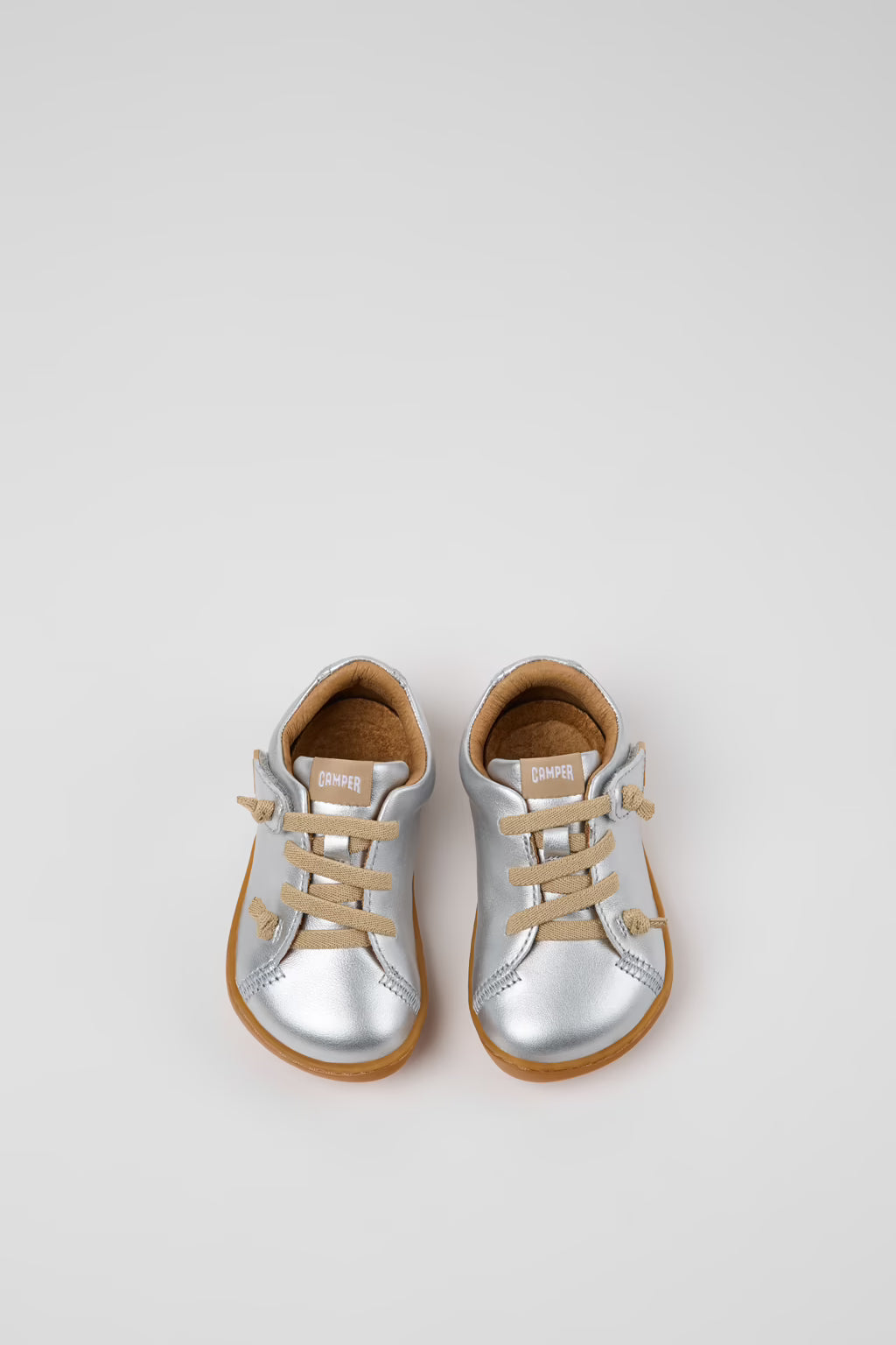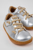 Gray pigskin shoes for kids with Podoactiva certification, removable EVA footbeds, elastic laces, hook-and-loop system and rubber outsoles (20% recycled).