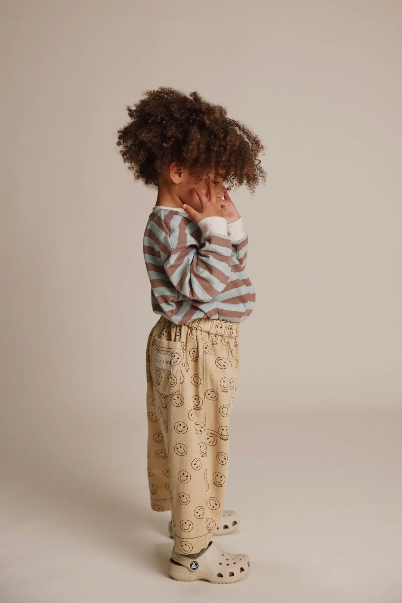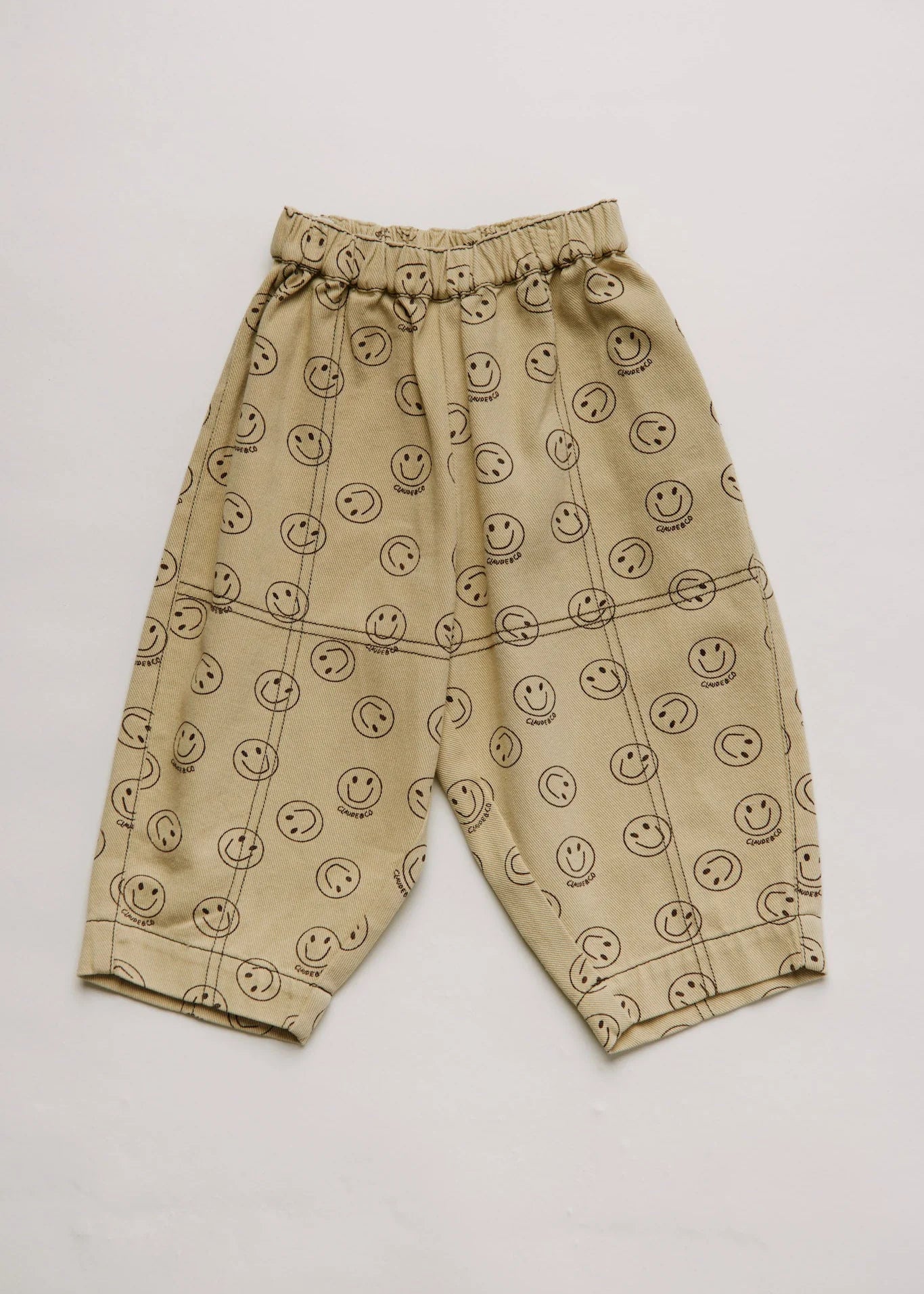 The Rex returns in warm butter, with an all-over smiley print in coco brown. Crafted from soft organic cotton twill. Cut in a full length silhouette with tapered balloon leg for a wide, baggy fit. Featuring an elasticated waistband with concealed internal size adjuster for easy adjustability. Finished with contrast stitch detailing.