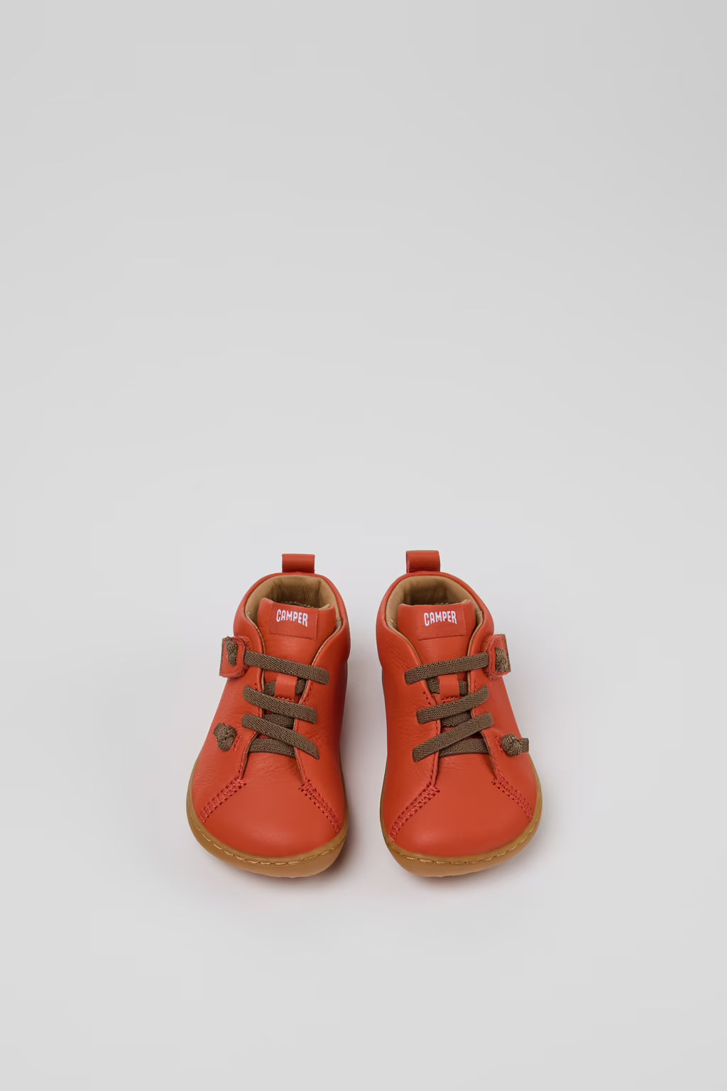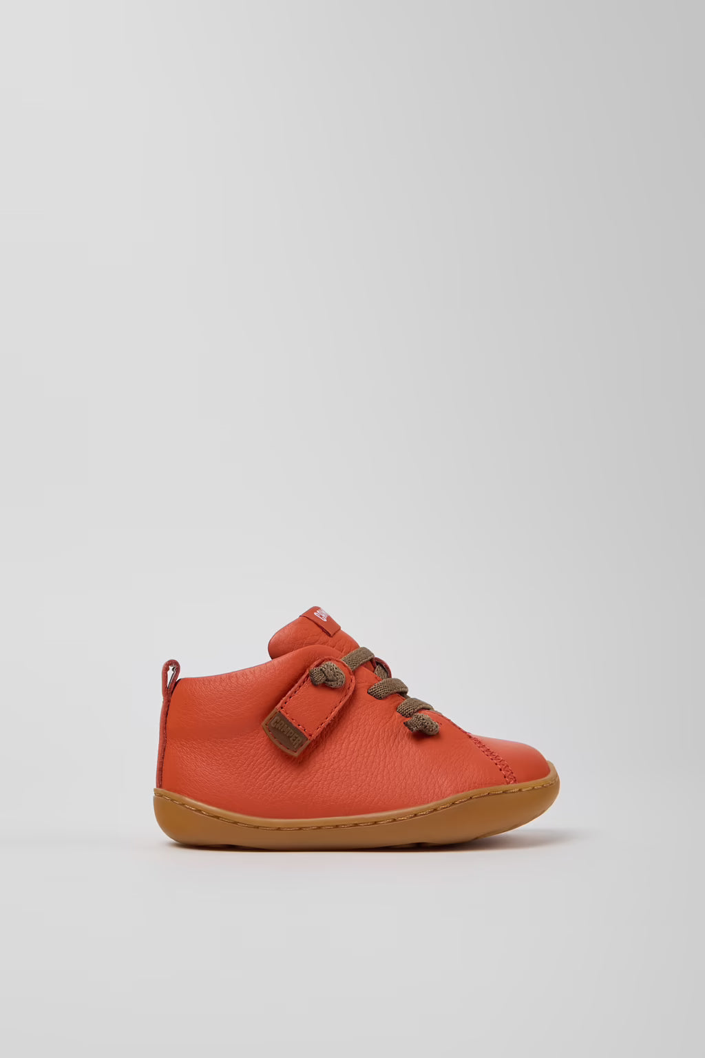 Step into comfort and sustainability with these orange calfskin leather kids’ ankle boots from Camper’s First Walkers range. Designed especially for toddlers learning to walk, these eco-friendly boots combine durability, flexibility, and stylish design—perfect for everyday adventures.