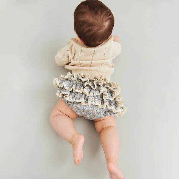 Printed nappy pants with large ruffles at back in soft woven organic cotton for babies.
