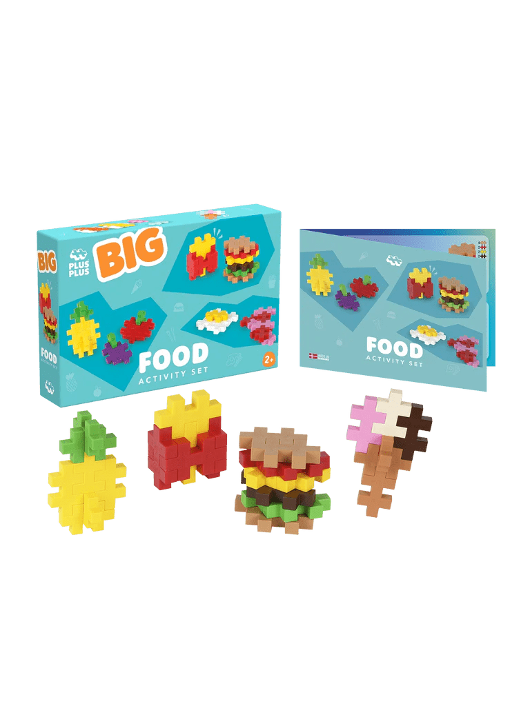 The BIG Food Building Set includes an inspiration book filled with fun ideas for creating your own imaginative dishes. The set contains 50 Plus-Plus BIG pieces, perfect for building burgers, hotdogs, sushi, or other culinary creations.