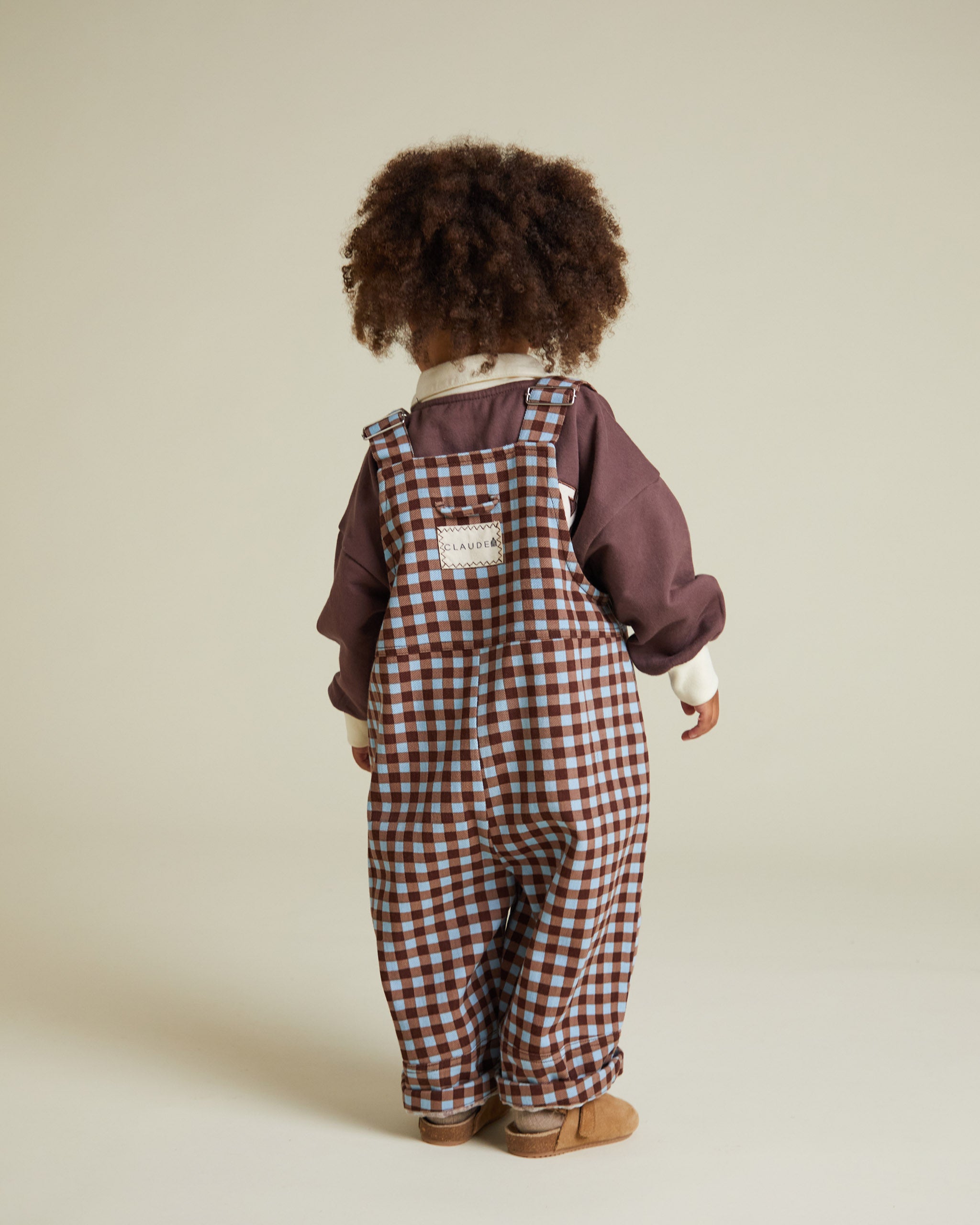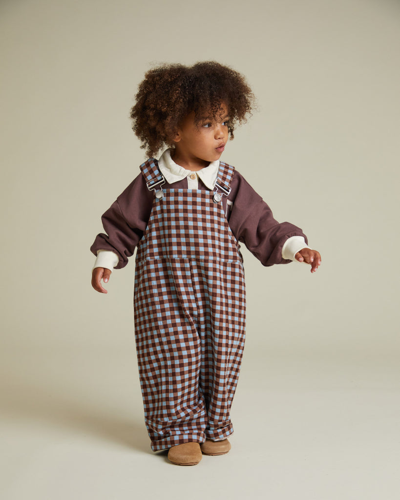 A fresh addition to our playful prints, the August Sky Gingham Dungaree reimagines our signature oversized, slouchy fit in a balloon-leg shape that’s perfect for rolling up. Made in India from 100% GOTS organic cotton, it features panel detailing on the front and back with contrast stitching and an oversized Claude & Co label on the back. Silver metal adjustable buckle fastenings and straps ensure the perfect fit, while an upper-back tab adds extra detail. Sizes 3-6 months and 6-12 months feature a discreet leg-popper fastening for ease during nappy changes. Finished in a rich chocolate brown and sky gingham pattern, this versatile dungaree is a stylish addition to any little one’s wardrobe.