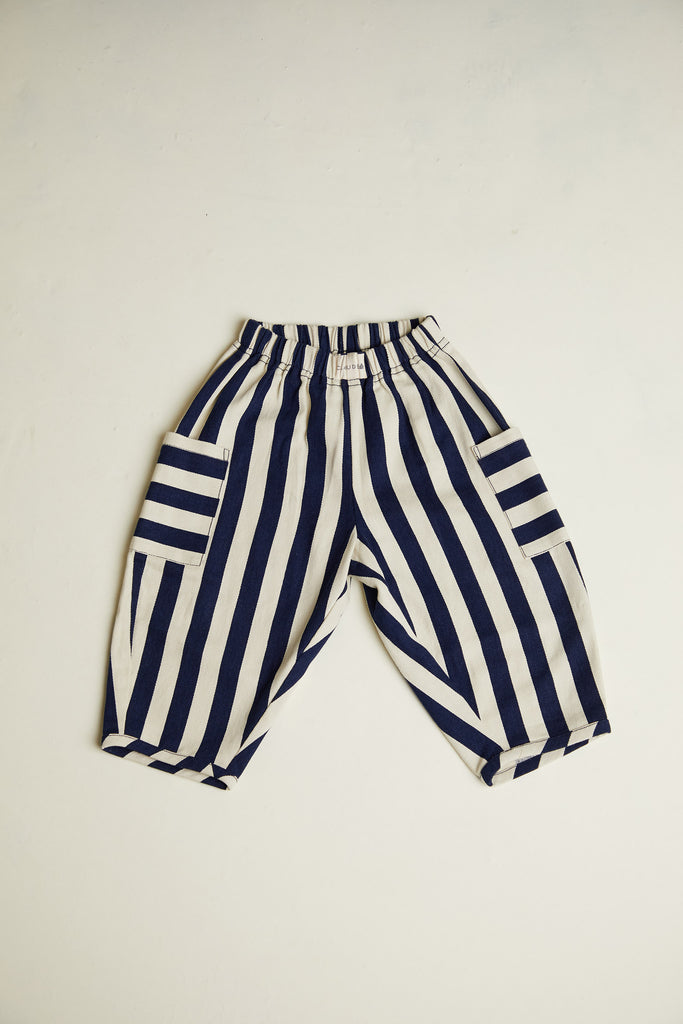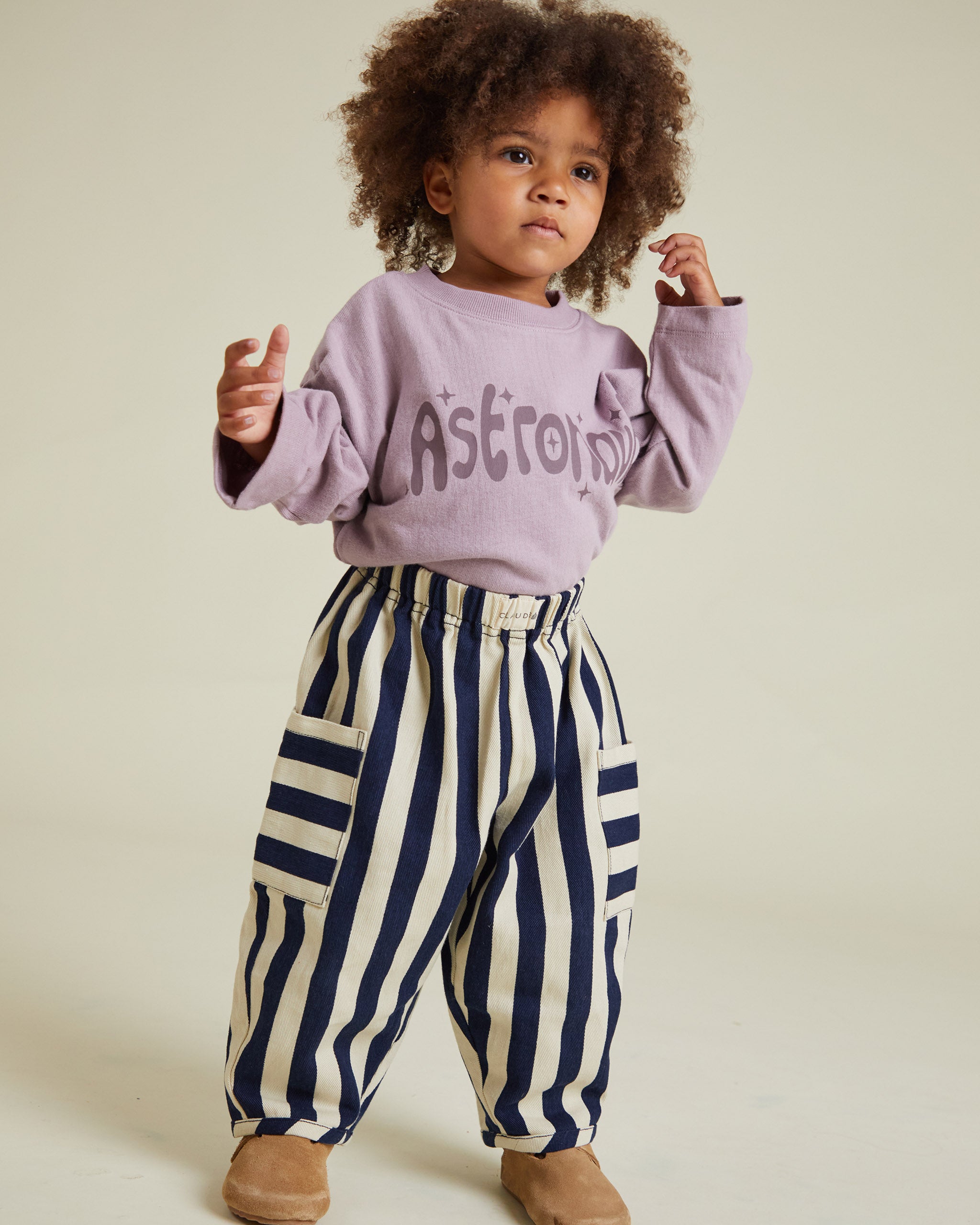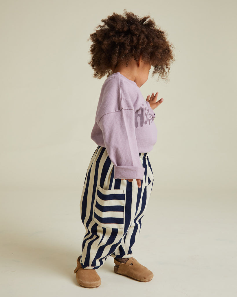 A playful new take on our must-have Emerson shape - the oversized, tapered balloon-leg trousers; now in a timeless midnight navy stripe. Made from 100% soft organic cotton, these unisex children’s trousers feature oversized side pockets and a stretchy, elasticated, branded waistband for comfort and ease. Perfect on their own or styled with the matching Rori Midnight Stripe Jacket, this is a statement piece ready to wear every season.