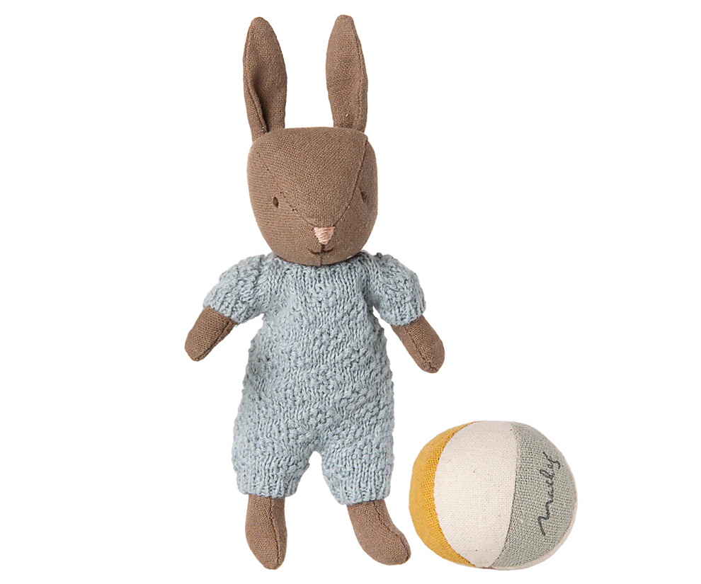 Introduce your little one to the magical world of Maileg with the Maileg Rabbit Micro Set in shade Brown/Blue. This beautifully curated gift set is designed to inspire hours of imaginative storytelling and gentle play. It includes a soft miniature rabbit dressed in an adorable blue knitted onesie, thoughtfully designed with magnets in its hands so it can hold the included baby bottle. This set also complete with a ball for an extra element of fun to every playtime adventure.