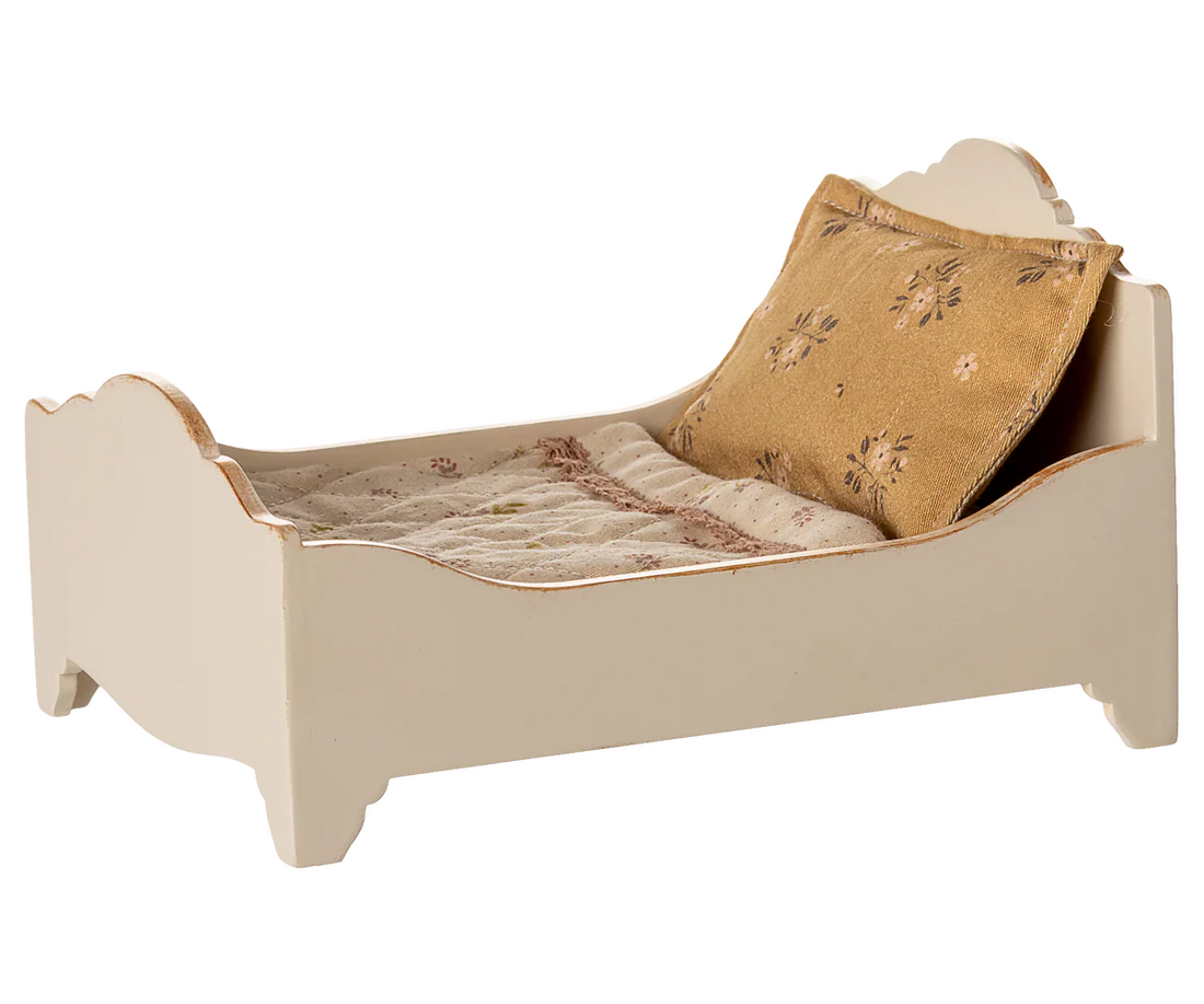 The perfect bed for a good nights sleep. This bed has beautiful small details such as golden finish on the wood and beautiful collected fabrics for bedlinen. Two mice can easily sleep side by side as it fits up to Grandma and Grandpa mice.