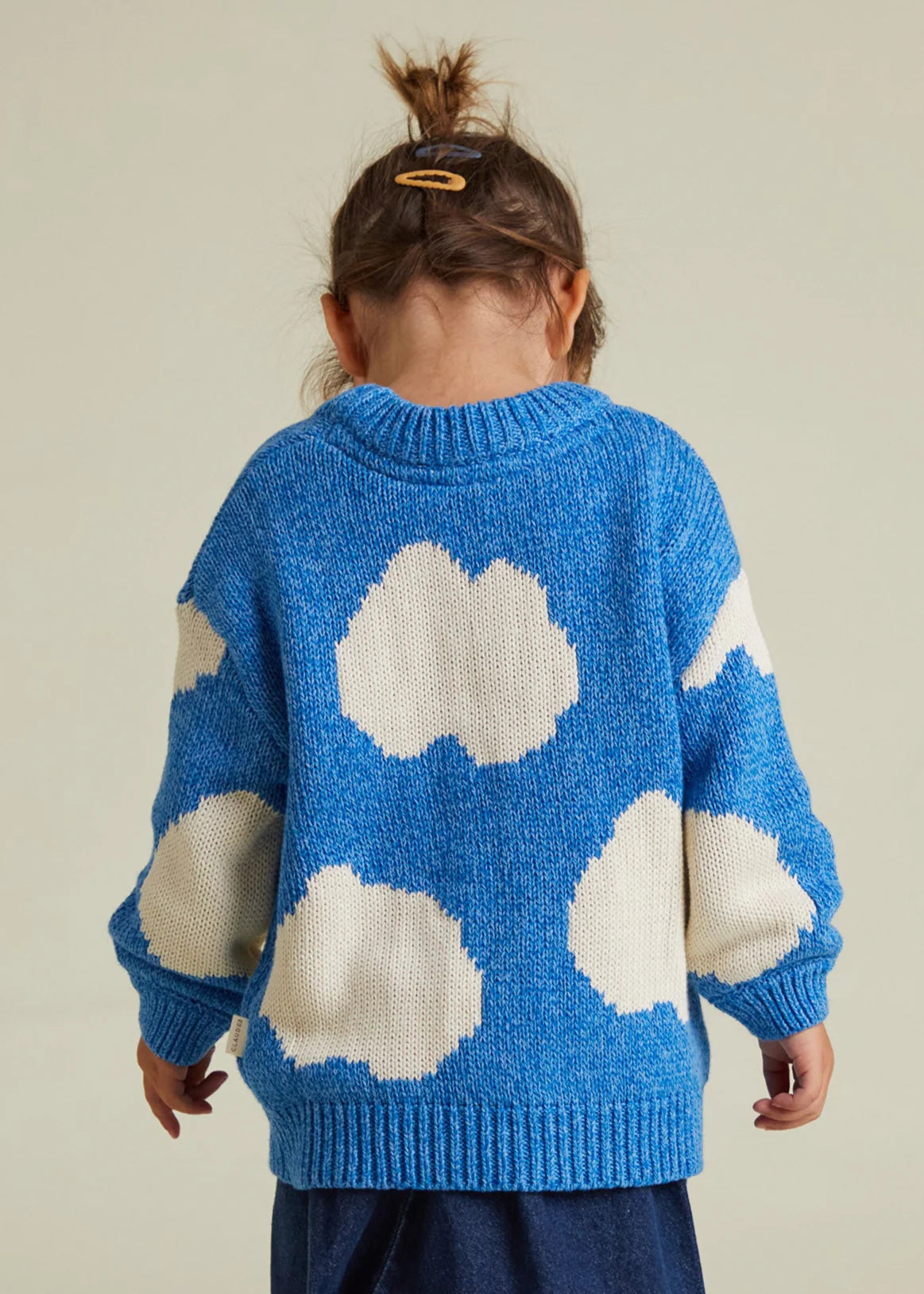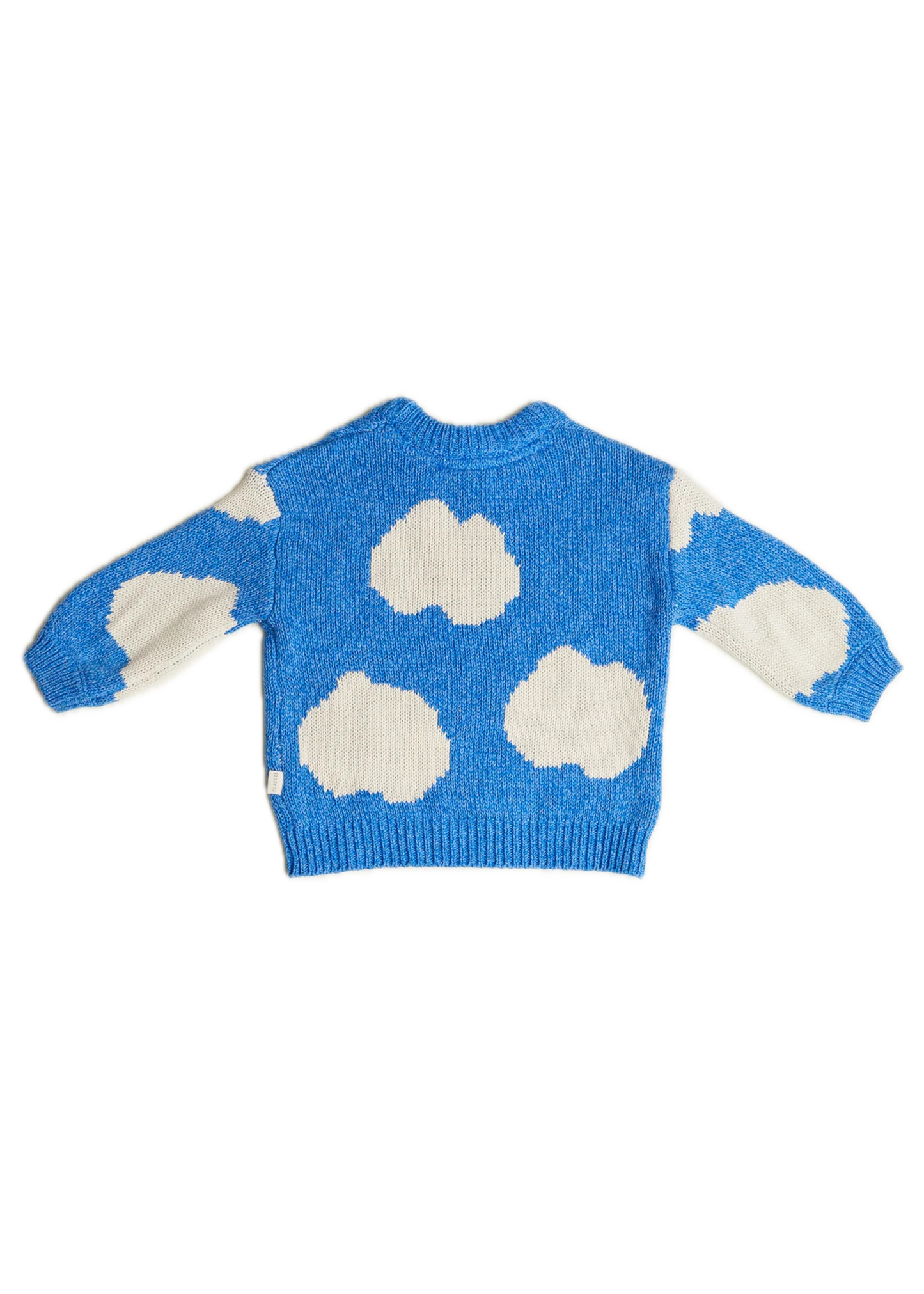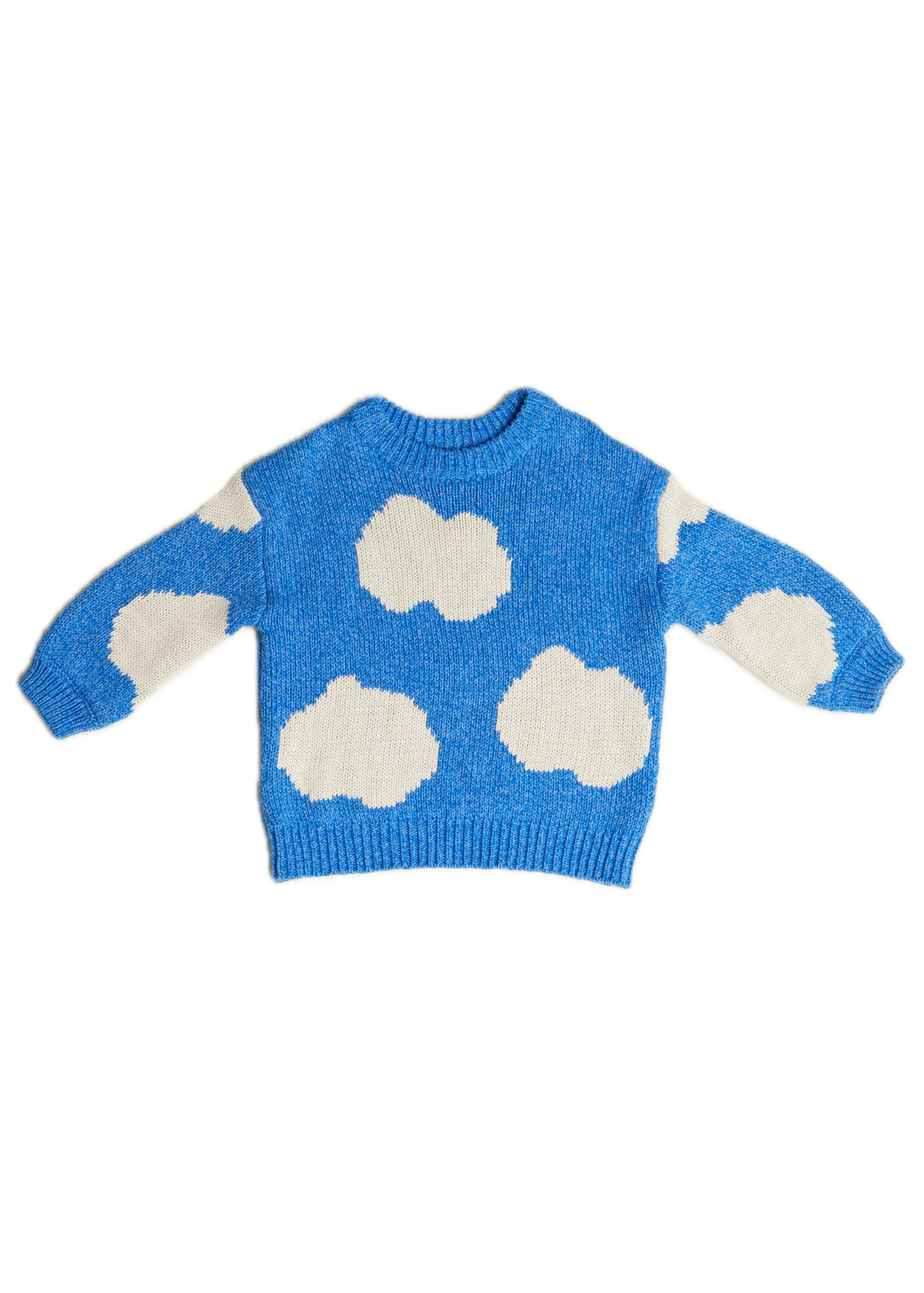 Knitted in 100% organic cotton using our signature twisted yarn technique, this piece has a soft blue base scattered with white clouds. Dropped shoulders and balloon-shaped sleeves add volume, while ribbed cuffs, hem, and neckline keep it grounded in comfort.