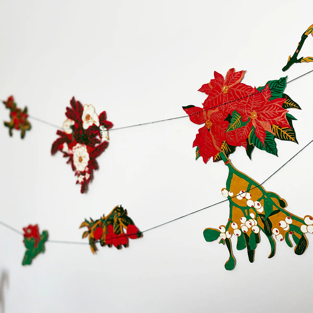 Bring timeless charm to your celebrations with this East End Press Traditional Festive Plants Garland. Measuring three metres in length, it showcases classic seasonal favourites – ivy, holly, mistletoe, poinsettias and red berries – in bold, hand-printed colour. Each of the ten intricate paper motifs is sewn onto strong cotton thread, ready to hang and instantly transform your space.