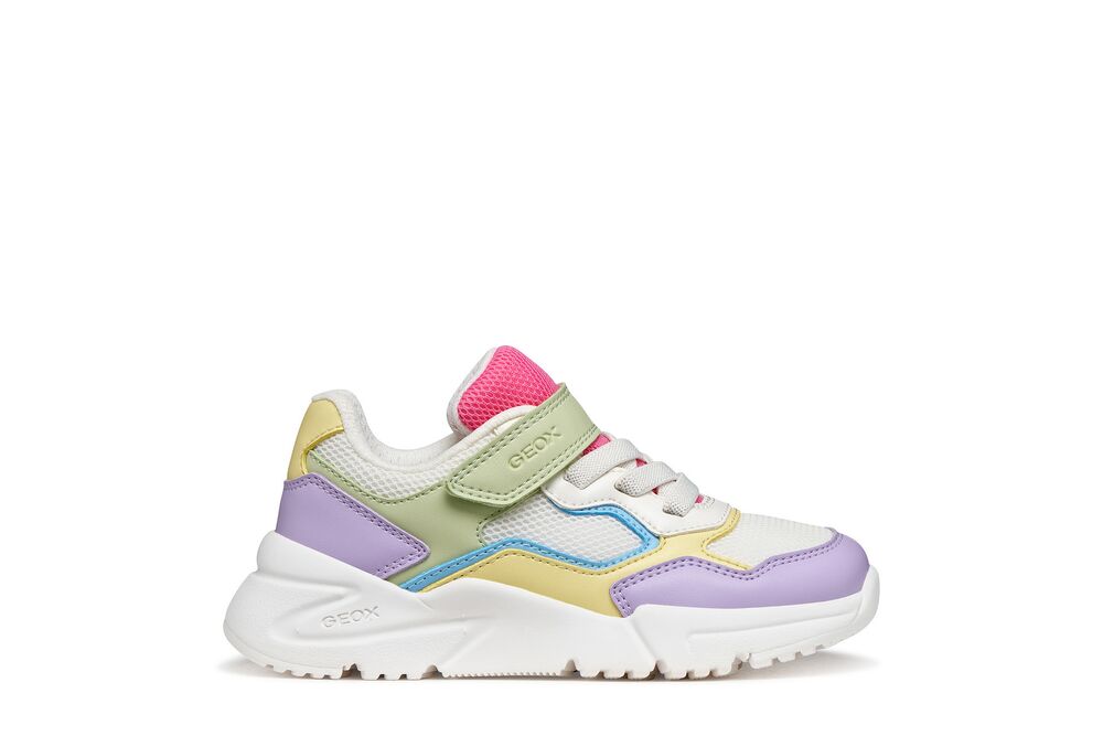 Girls sneakers with a sporty, modern design inspired by running. In this multicoloured version with white inserts, they are made from leather-effect material and mesh with reinforced toes. Breathable and comfortable, Loftus adds a fashionable touch to outfits for school and leisure