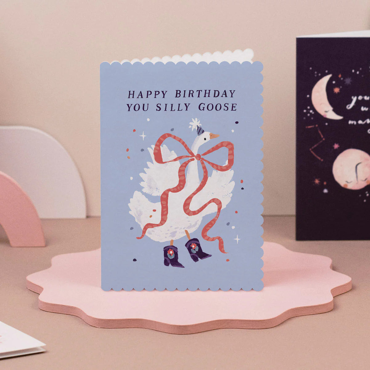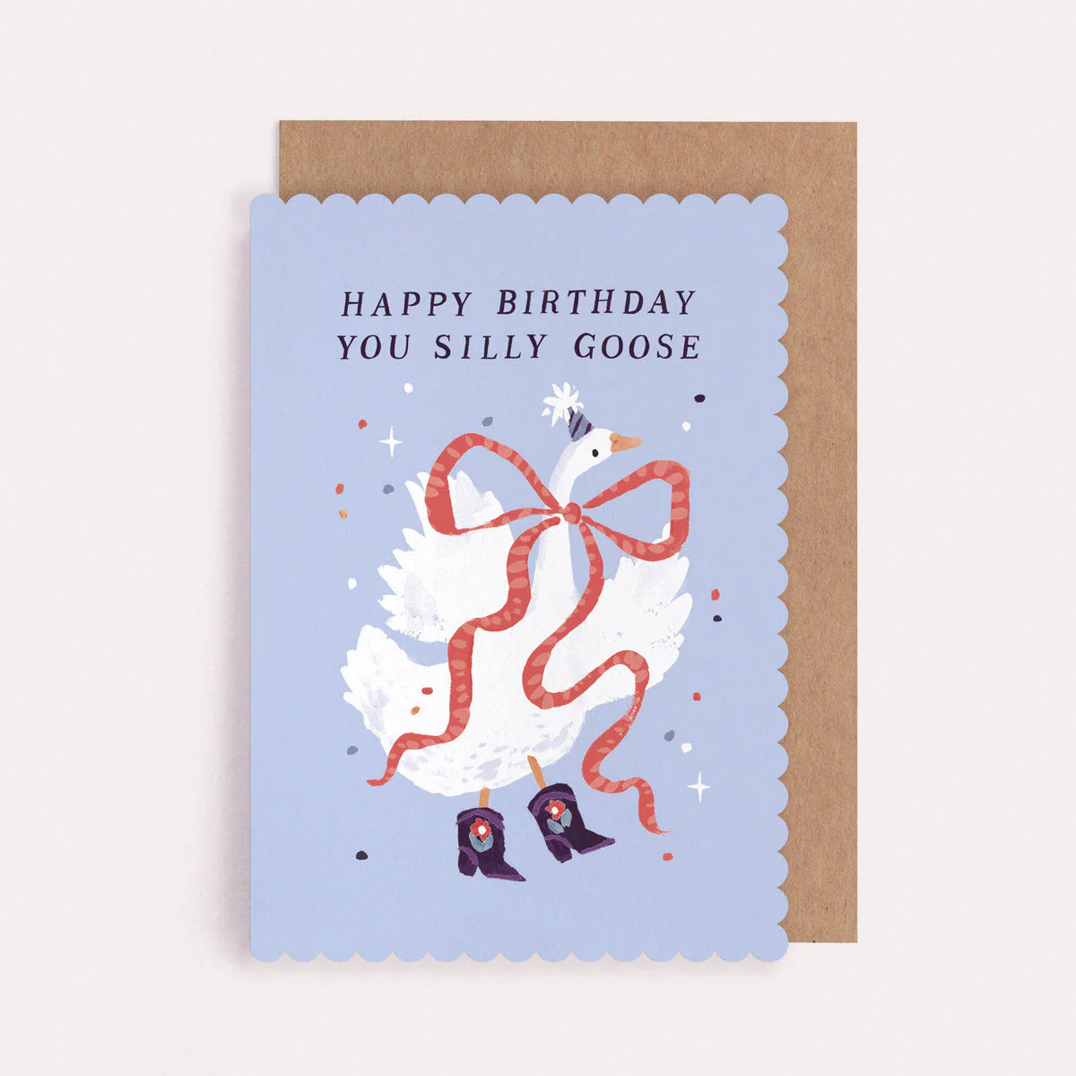 This whimsical birthday card is the perfect gift for anyone with a love of the ludicrous! The hand-lettered caption reads "Happy Birthday You Silly Goose", headlining over the stunning hand-illustrated artwork of a stylish white goose flaunting purple embroidered cowboy boots, a party hat and an enormous red ribbon tied in a bow. The light blue background of the silly goose birthday card ends in a shaped scalloped edge, adding an extra touch of magic to the unique design. Add your own handwritten message to the blank inside of the funny birthday card for that personal touch.