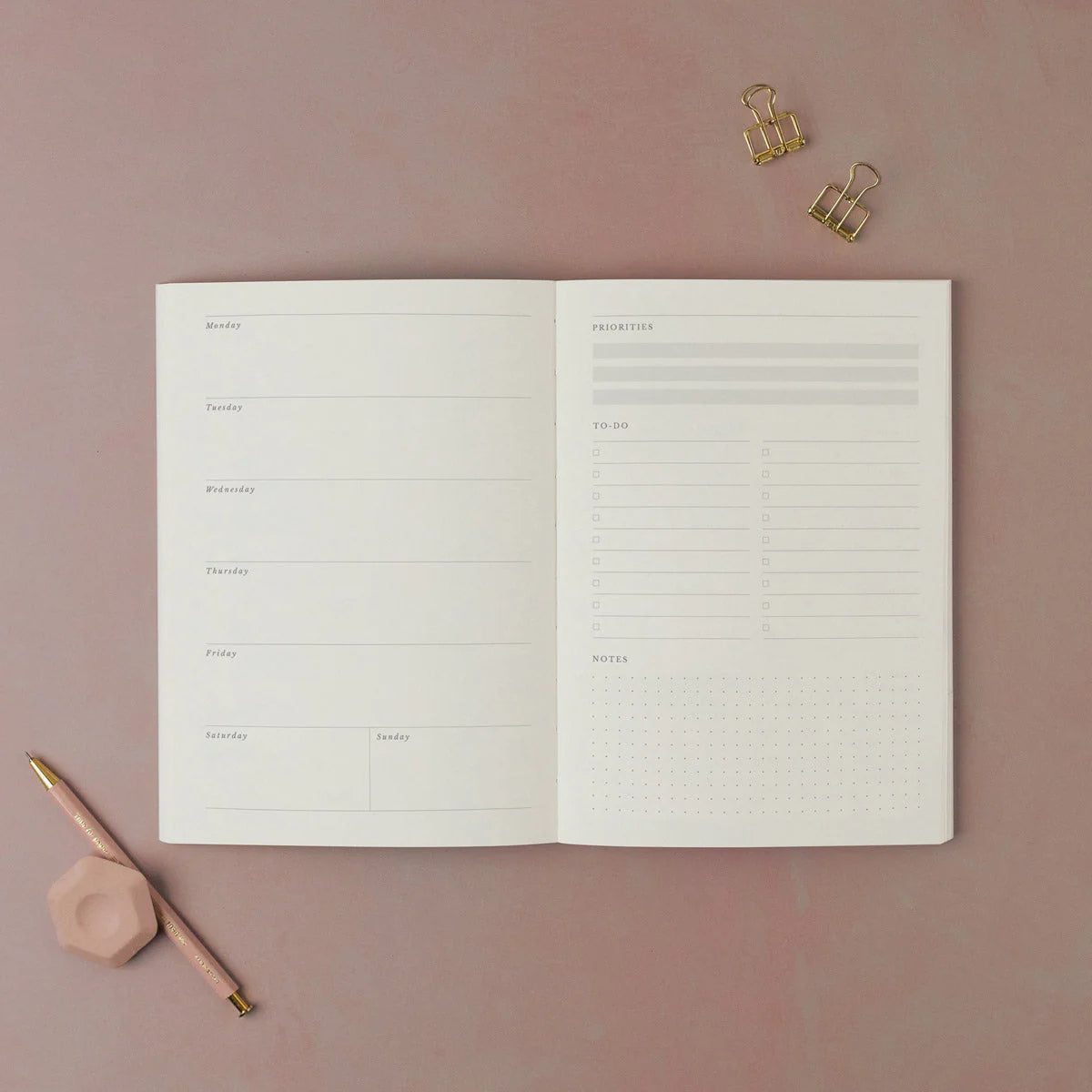 Focus on the tasks ahead with your new organisational companion: the undated weekly planner - is filled with structured pages to assist with both large-scale planning down to scribbling notes.