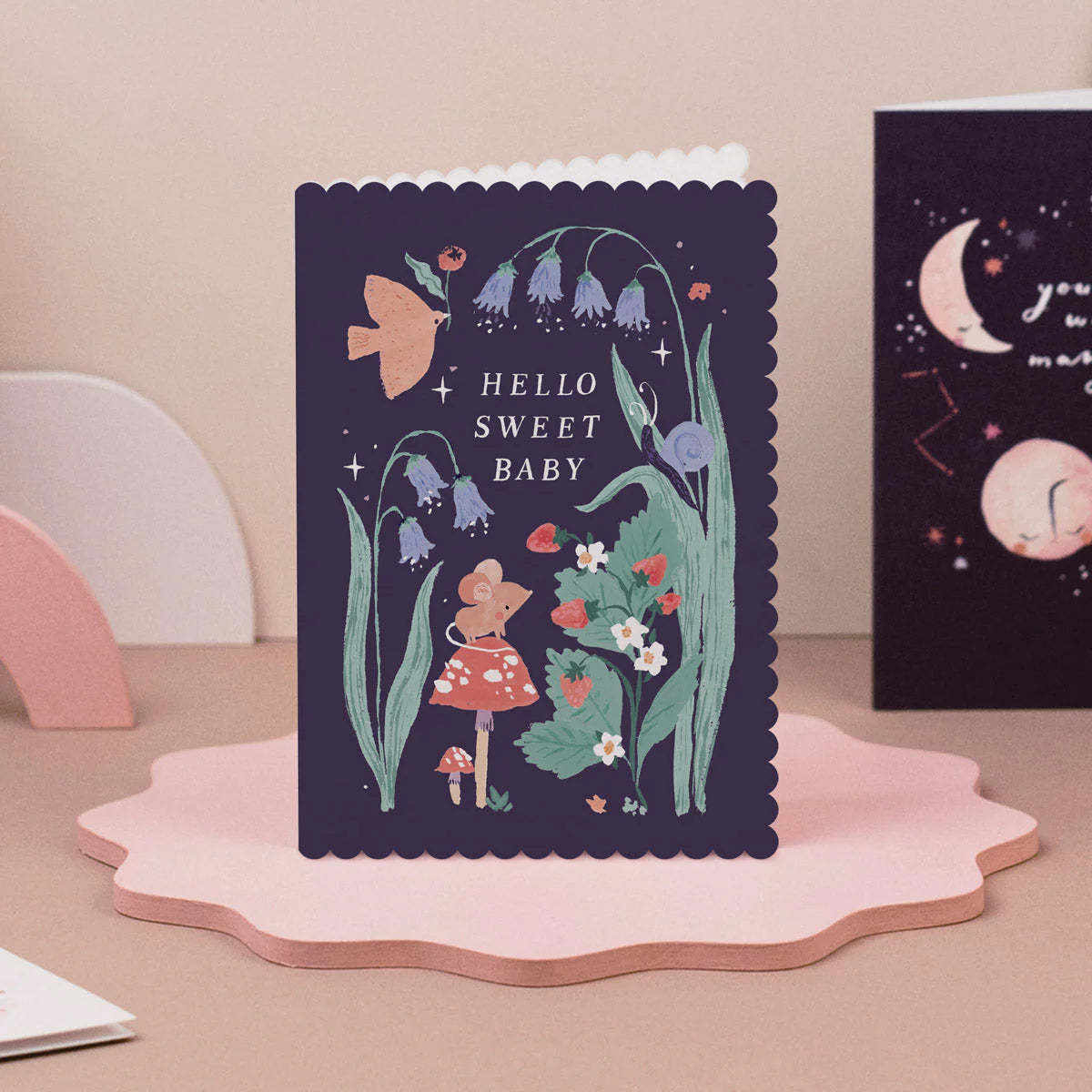 This adorable new baby card evokes the magic of the woodlands, where curious creatures gather to welcome a new little one to the world with the words "Hello Sweet Baby". Among the mysterious blooming blossoms and botanicals on the newborn baby greeting card, a sweet little mouse perches on top of a toadstool, watching as a bird soars through the inky darkness. The edges of the adoption card have been cut into a sweet scalloped shape for a unique touch. Add your own words of congratulations on a growing family to the blank inside of the baby card to make it personal.
