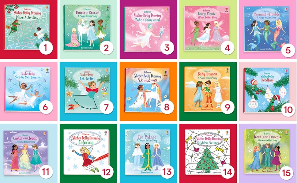 Open each window in this magical advent calendar to discover a story or activity book hidden behind it. There are 12 magical Sticker Dolly Story books featuring fairies, mermaids and unicorns, and 12 little activity books, including drawing, doodling, puzzles and three sticker books.