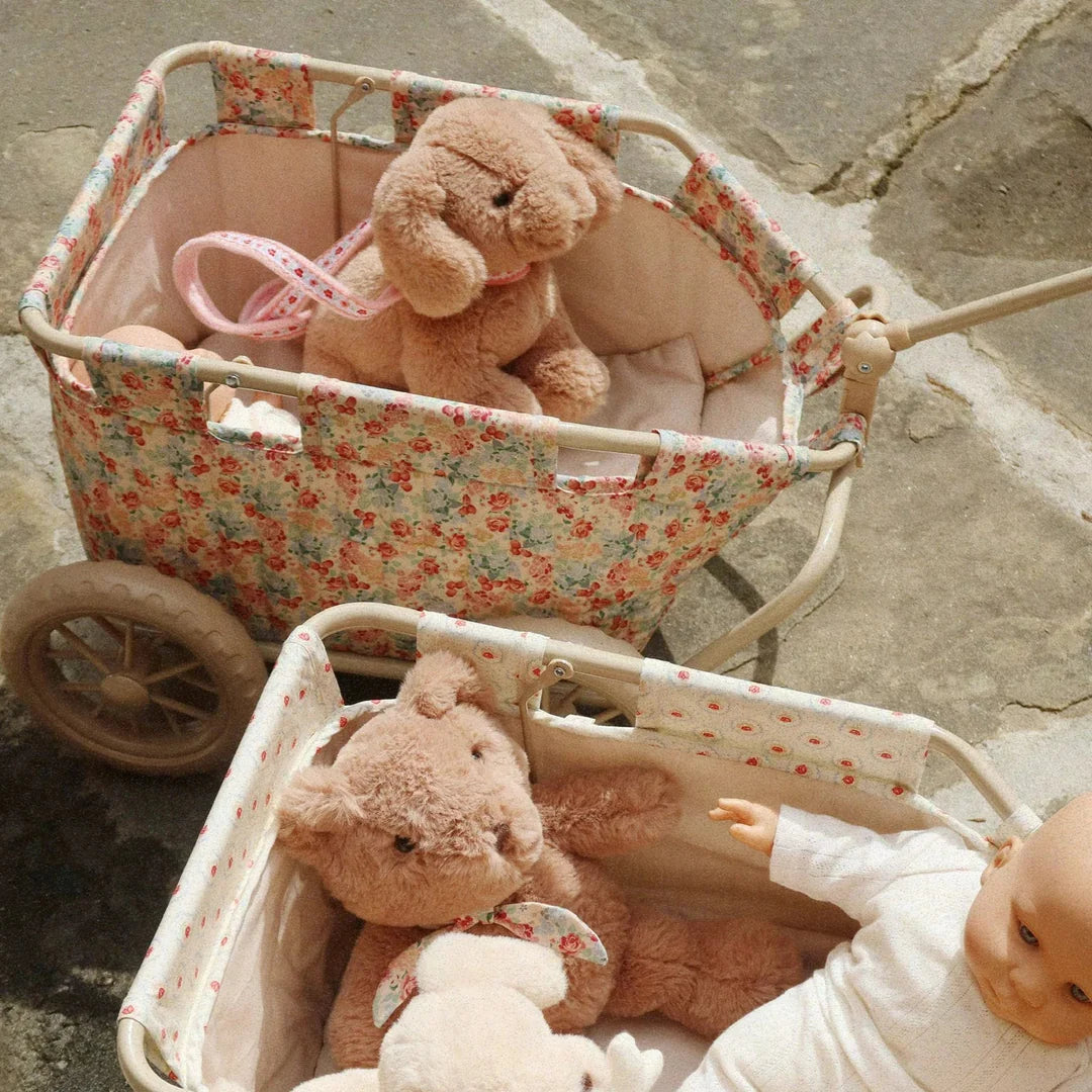Here's the perfect companion to take all your besties with you for a ride. Our Kids' stroller wagon is designed with a sturdy metal frame and lined with soft cotton. Features smooth, easy-glide wheels and a handle that is sized just right for little hands. Pack all your best dolls and teddy bears and take them with your wherever you go!