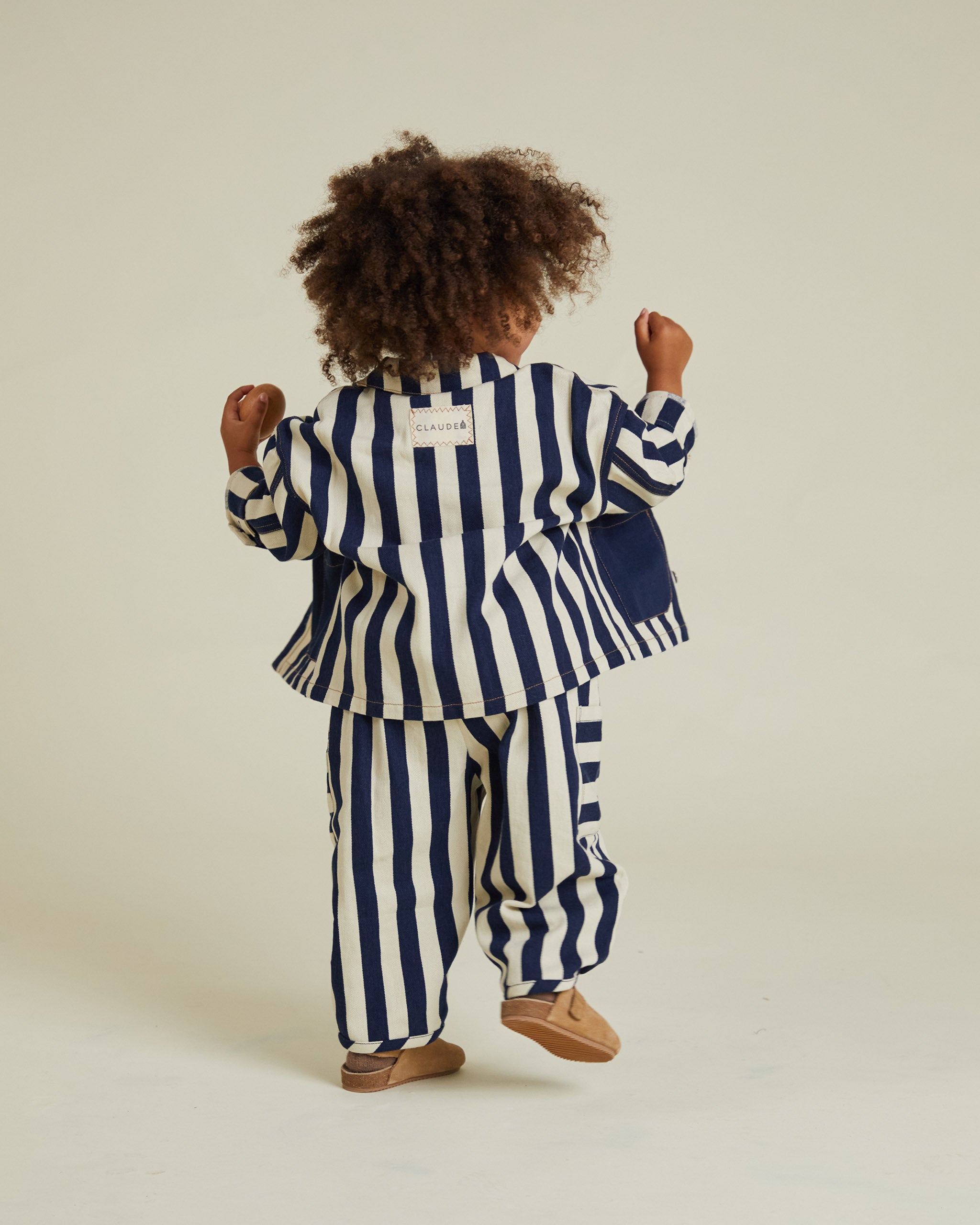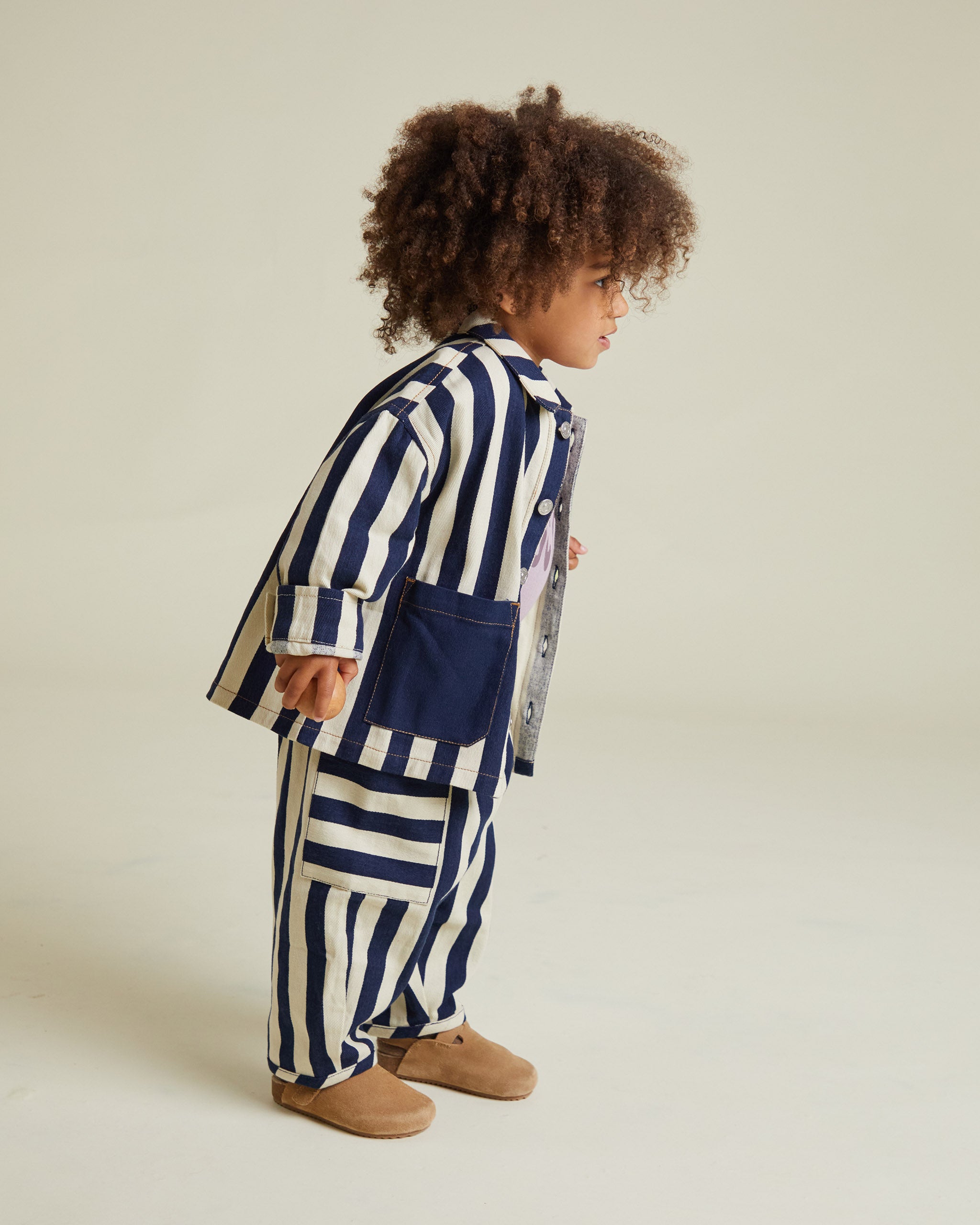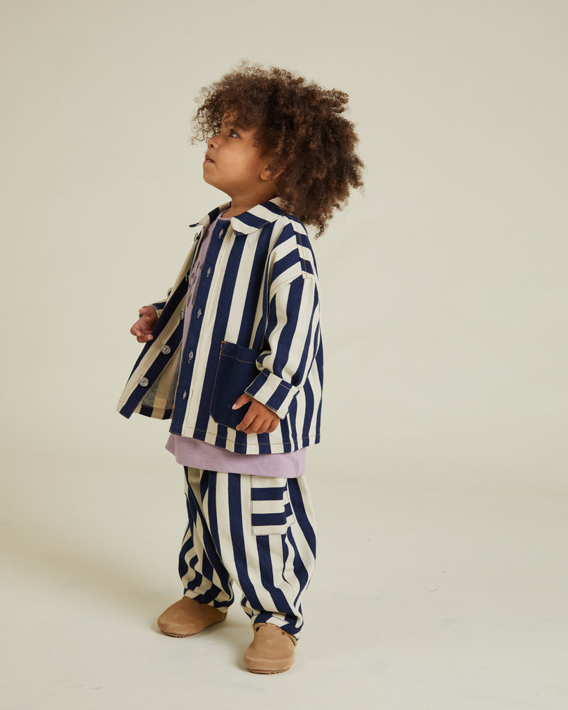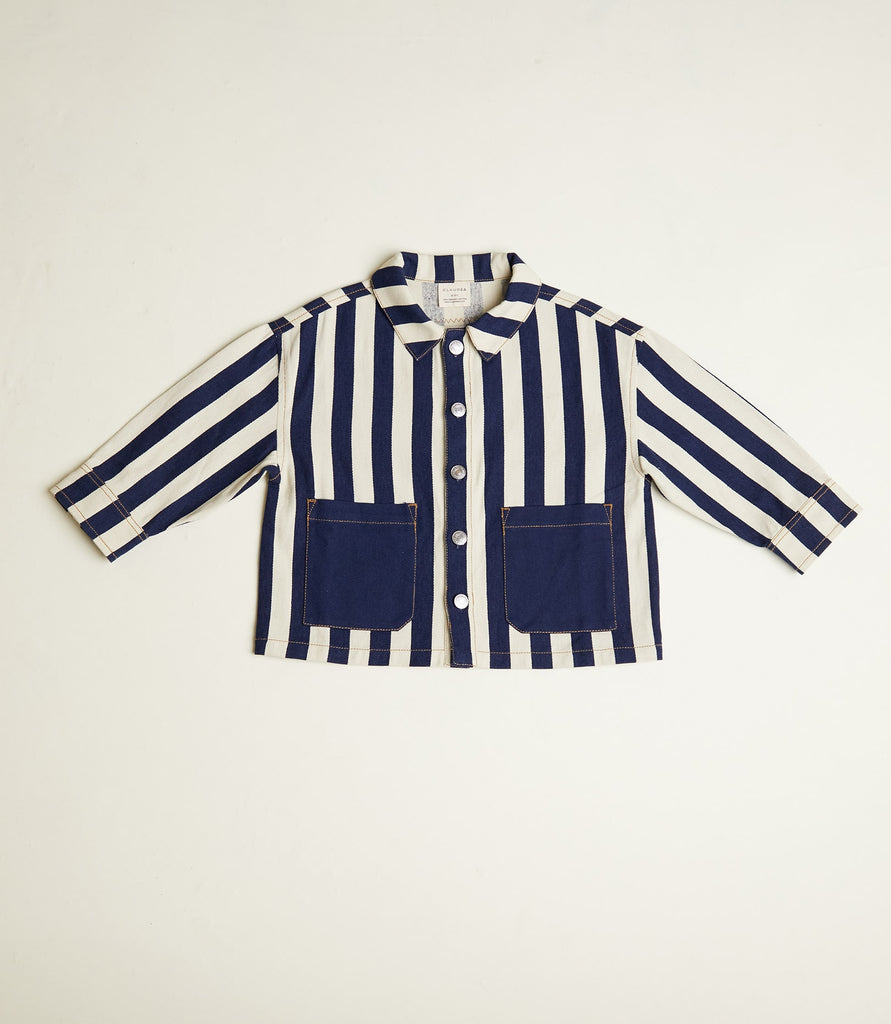 A familiar favourite, now in a bold new print, the Rori Midnight Stripe Jacket keeps our signature boxy, oversized, slouchy shape you know and love but introduces a timeless Midnight Navy Stripe with contrast stitching.