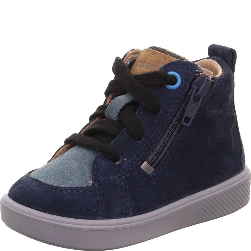 The Superfit SUPIES trainers bring sporty style and all-day comfort to little feet. With their chrome-free leather lining and removable leather insole, they’re soft, breathable, and kind to skin. The side zip makes them quick to slip on and off, while the laces ensure a snug, supportive fit. A flexible sole supports the foot’s natural rolling movement, while metal eyelets, a heel loop, and a high-top sneaker silhouette give them a grown-up, on-trend look. Crafted from durable suede and textile with Leather Working Group certified materials, they’re sustainable, stylish, and perfect for active autumn/winter adventures.