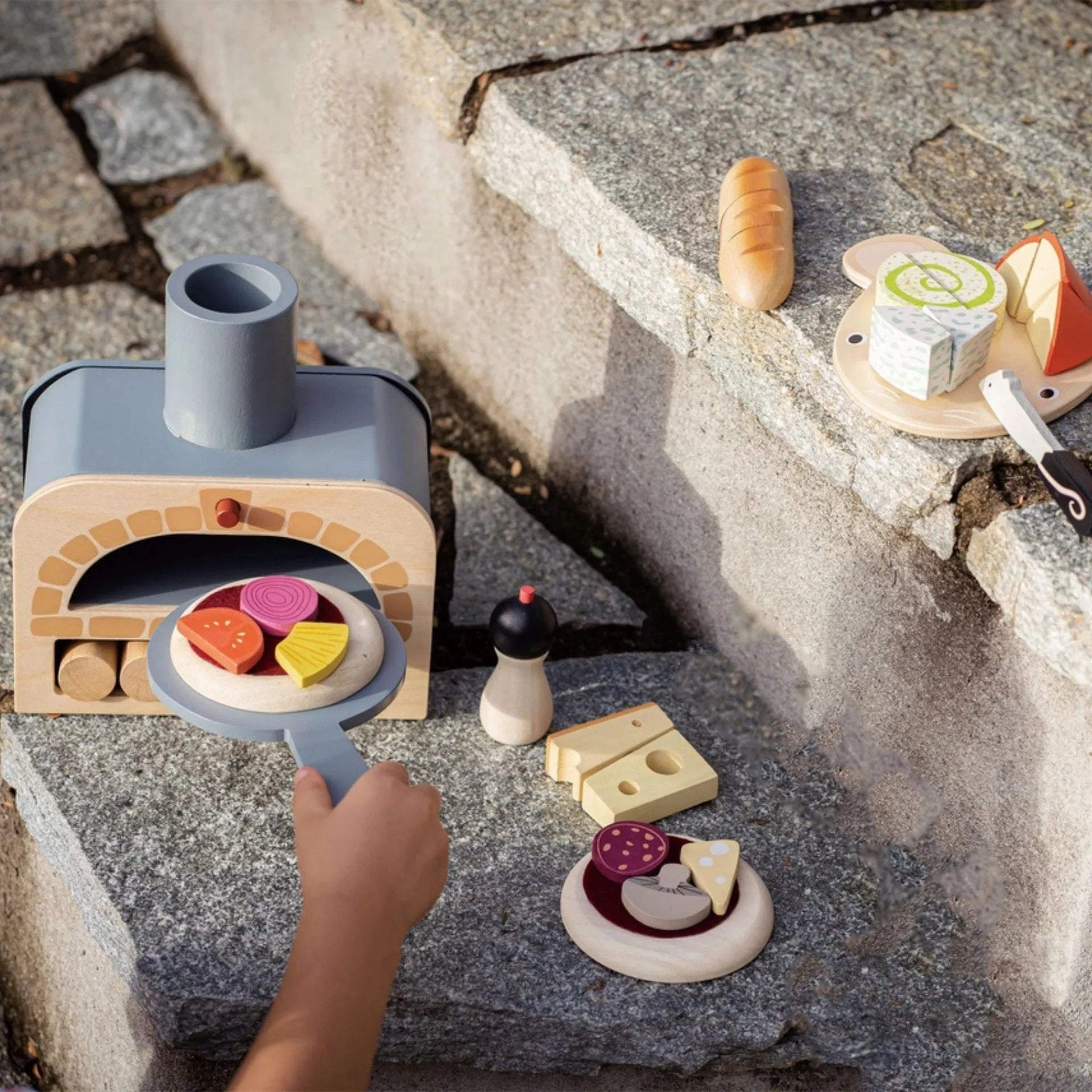 A wonderful wooden pizza oven toy which comes complete with 2 pizza bases, felt tomato base topping, and 6 wooden toppings all with a velcro dot so that they can be stuck to the felt. Also includes a pizza slice, a salt shaker and 5 wooden logs.