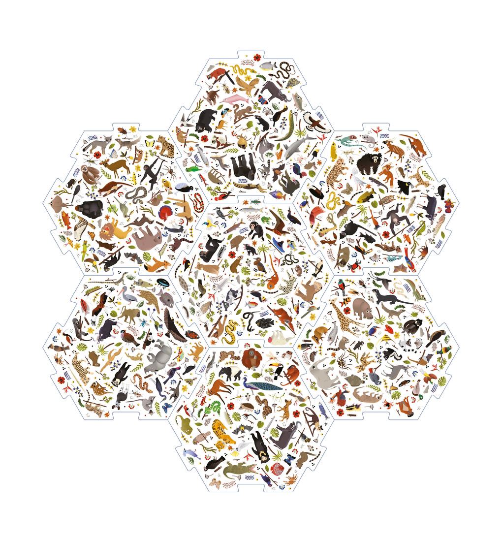 300 jungle animals are hiding in plain sight on this gameboard. Can you be the first to spot the giraffe - or even the giraffe weevil? Now presented in a square box, Jungle includes a double-sided hexagonal board with multiple combinations, and 300 counters with charming animal illustrations. Simple to understand and addictive to play, this fun and challenging game will delight adults and children alike.