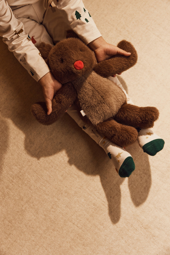 In the shape of a cute reindeer and crafted from super soft GRS-certified materials, this cuddly companion will keep little ones cosy through December daytime adventures and calm during bedtime stories.