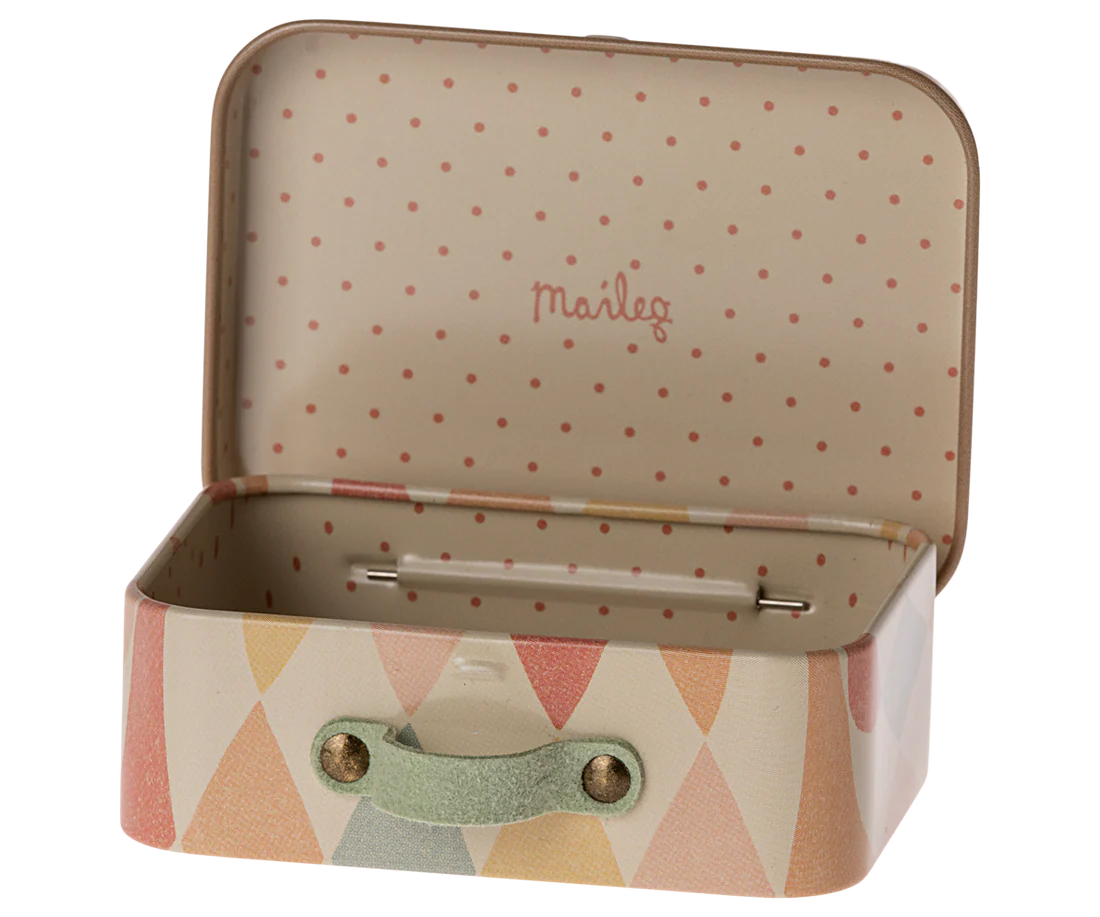 This small metal suitcase with colorful illustrations and beautiful details can be used for any occasion: small gifts, storage of small items or for mice and small bunnies to bring their belongings on the go.