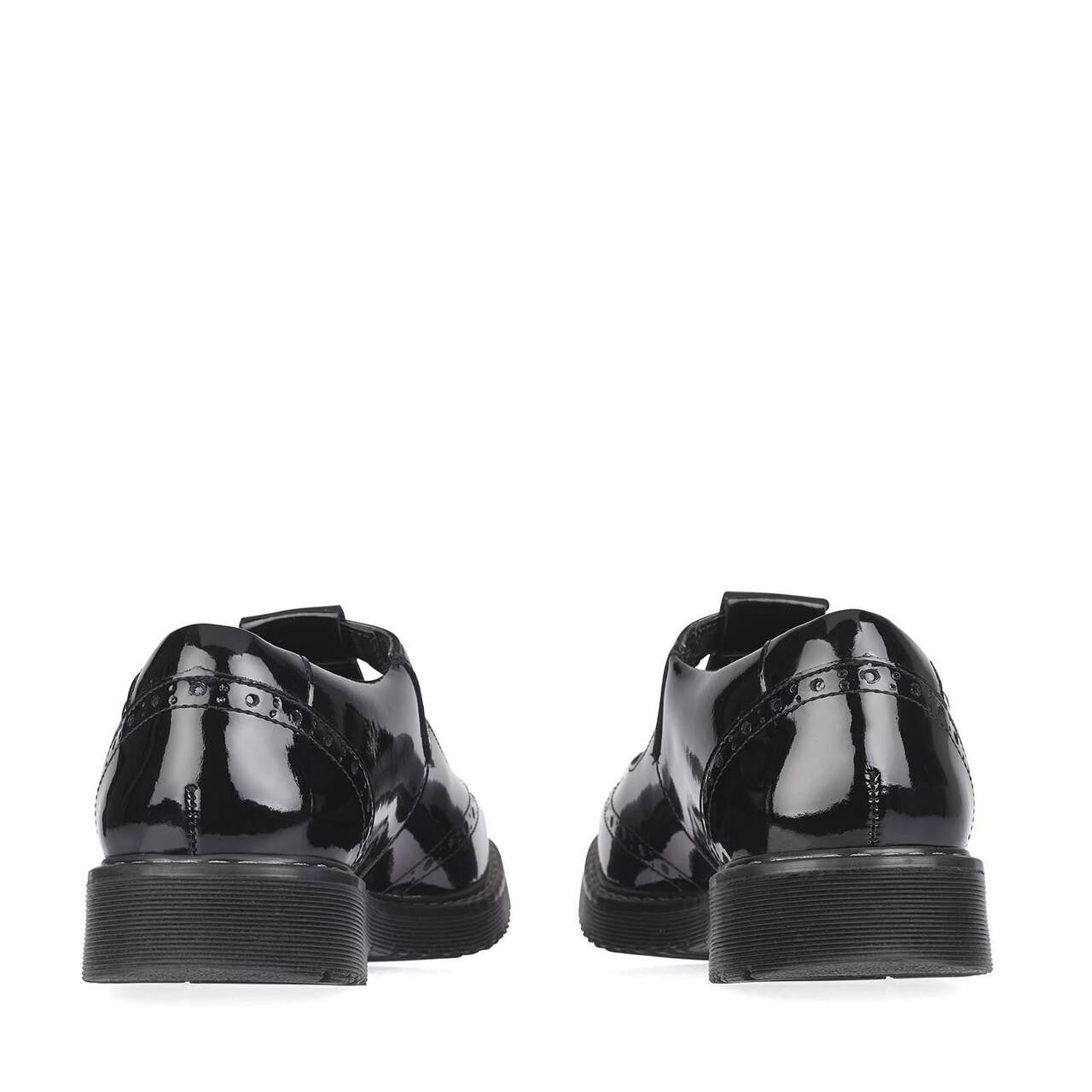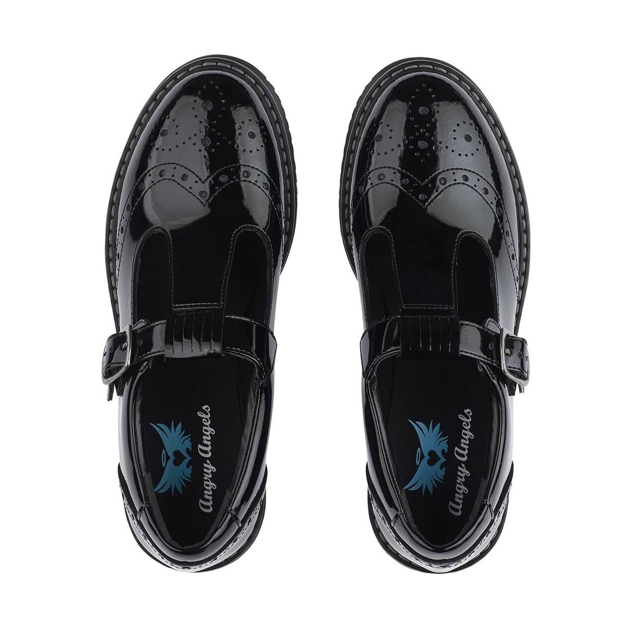 The Angry Angels Imagine black patent school shoe is a standout choice for any stylish student. With a sleek t-bar fastening, this shoe combines fashion and practicality, featuring a bold, chunky sole designed for durability and all-day comfort. The sophisticated brogue punch detailing adds a touch of classic style, while the breathable mesh linings ensure feet stay cool and fresh, even during busy school days. Built to withstand the demands of both the classroom and playground, these shoes offer a perfect balance of style, comfort, and support.